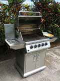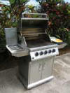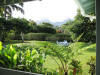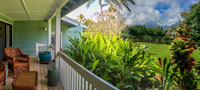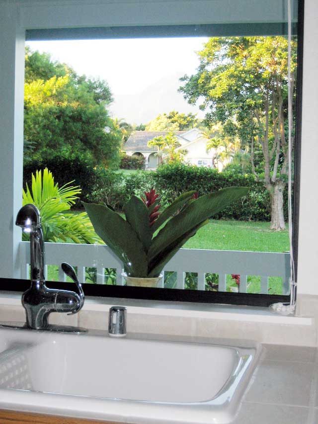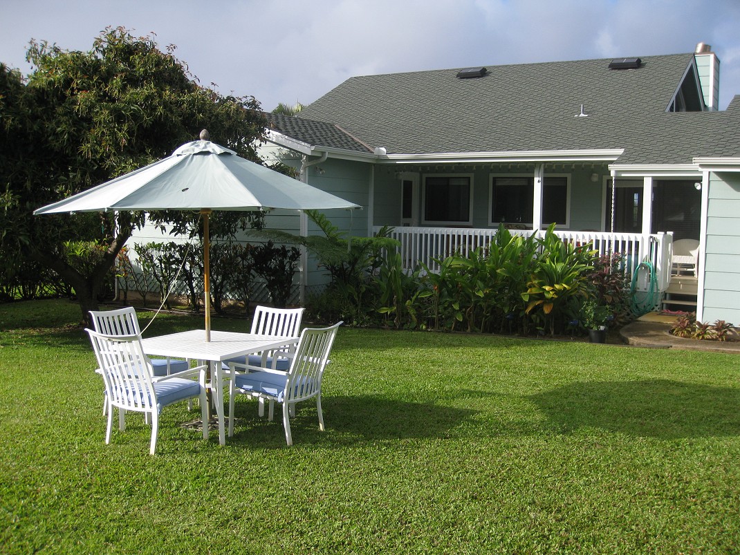 After a day of fun, you can cook on the large stainless steel gas grill. The new grill has three burners, a rotisserie, and a side burner. The backyard is large and level, surrounded by hedges for privacy. But not too tall to block your view of the Na Pali mountains. You can see the main waterfall from here.