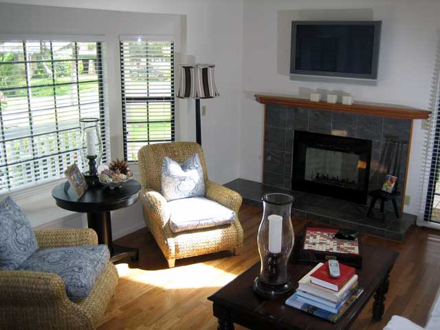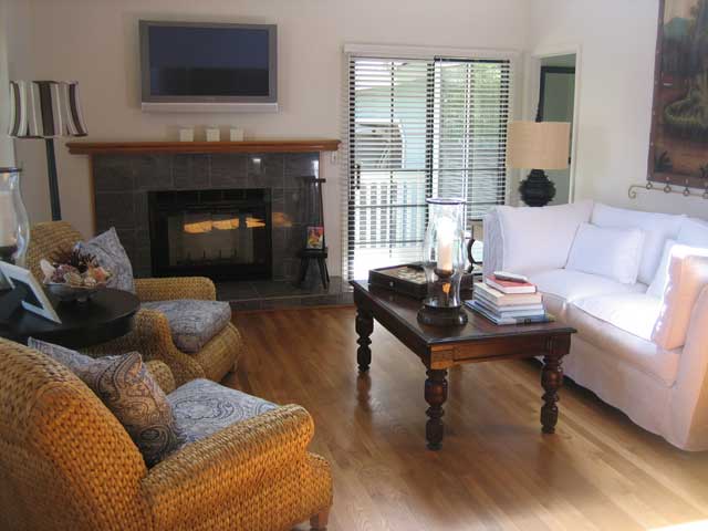 A Plasma TV screen is above the fireplace in the two story living room to set a relaxing mood for entertainment with the latest in technology. In addition to the cable TV, you also have a DVD player and a library of DVD’s to choose from.